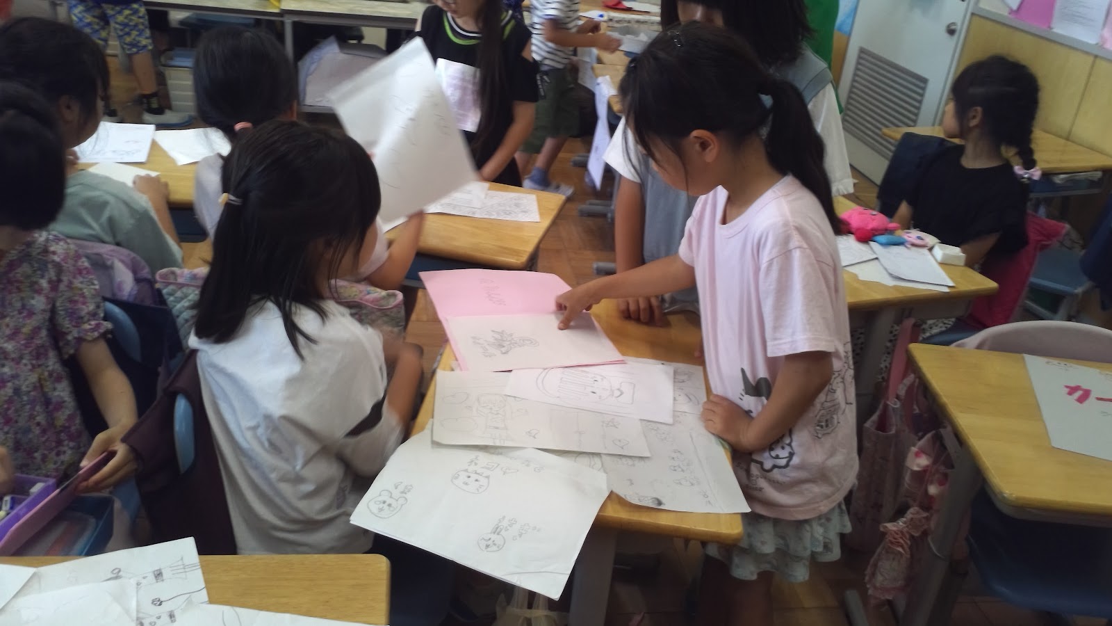 わかば学級の3・4年生で、80周年記念キャラクター「ウクニン」の絵描き歌を考えました。わかば学級の他の学年でも、絵描き歌にのせて「ウクニン」を描いてみました。